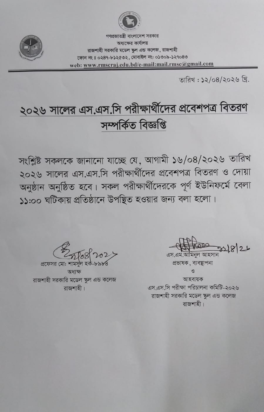 ২০২৬ সালের এসএসসি পরীক্ষার্থীদের প্রবেশপত্র বিতরণ সম্পর্কিত বিজ্ঞপ্তি