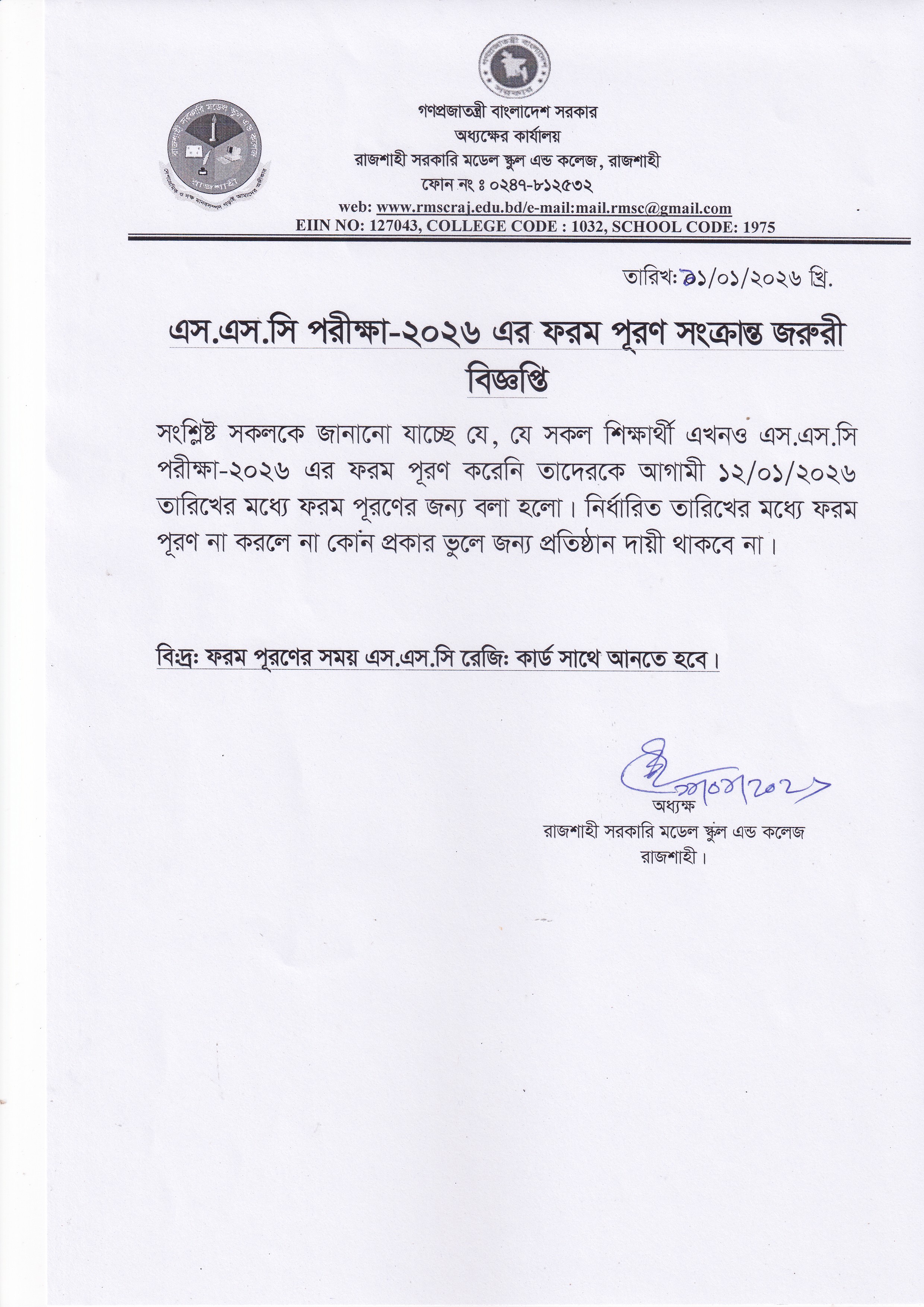 এস.এস.সি পরীক্ষা-২০২৬ এর ফরম পূরণ সম্পর্কিত জরুরী বিজ্ঞপ্তি।